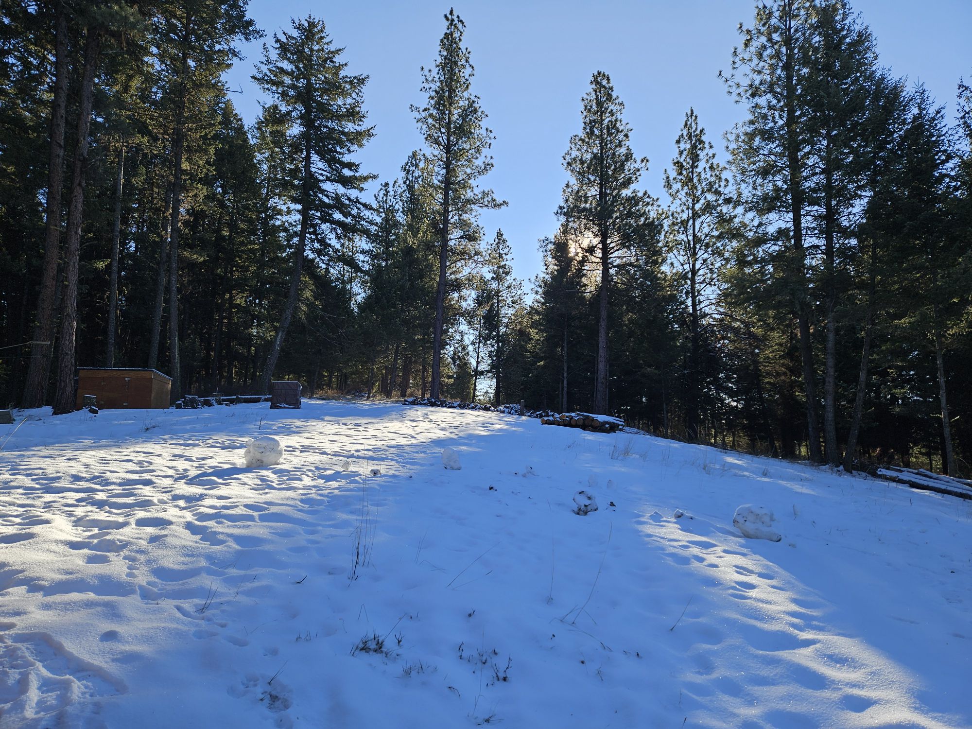 Okay, I remembered another scary thing. It was one night when I decided I wanted the mail. Jeff didn’t feel like going down there. I didn’t feel like waiting for morning. Itâll be a fun adventure! Going for a walk by the light of the silvery moon. Why not? Only half a mile down the hill in the snow. I canât say I enjoyed it. I was partly showing off how brave I am, which is a dumb reason to do things. That dog started acting all dodgy again. I didnât see or hear anything, but she slunk along looking nervously in all directions and wishing she was back at home until it got to me and I did, too. At least I got the mail. And two awesome pictures of the light of the silvery moon. Here is the same spot looking in two directions. One looking at the moon as it came over the hill, then I turned around and thereâs what it was shining at. The phone camera did a great job absorbing the light and making things more visible. To my eyes it was darker than this.